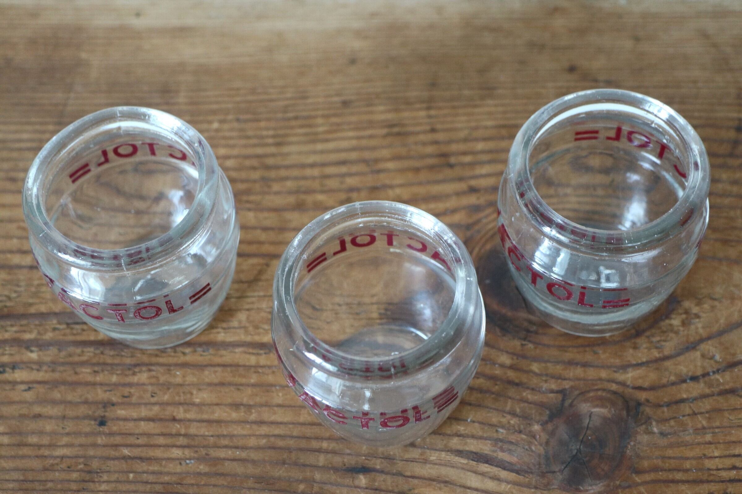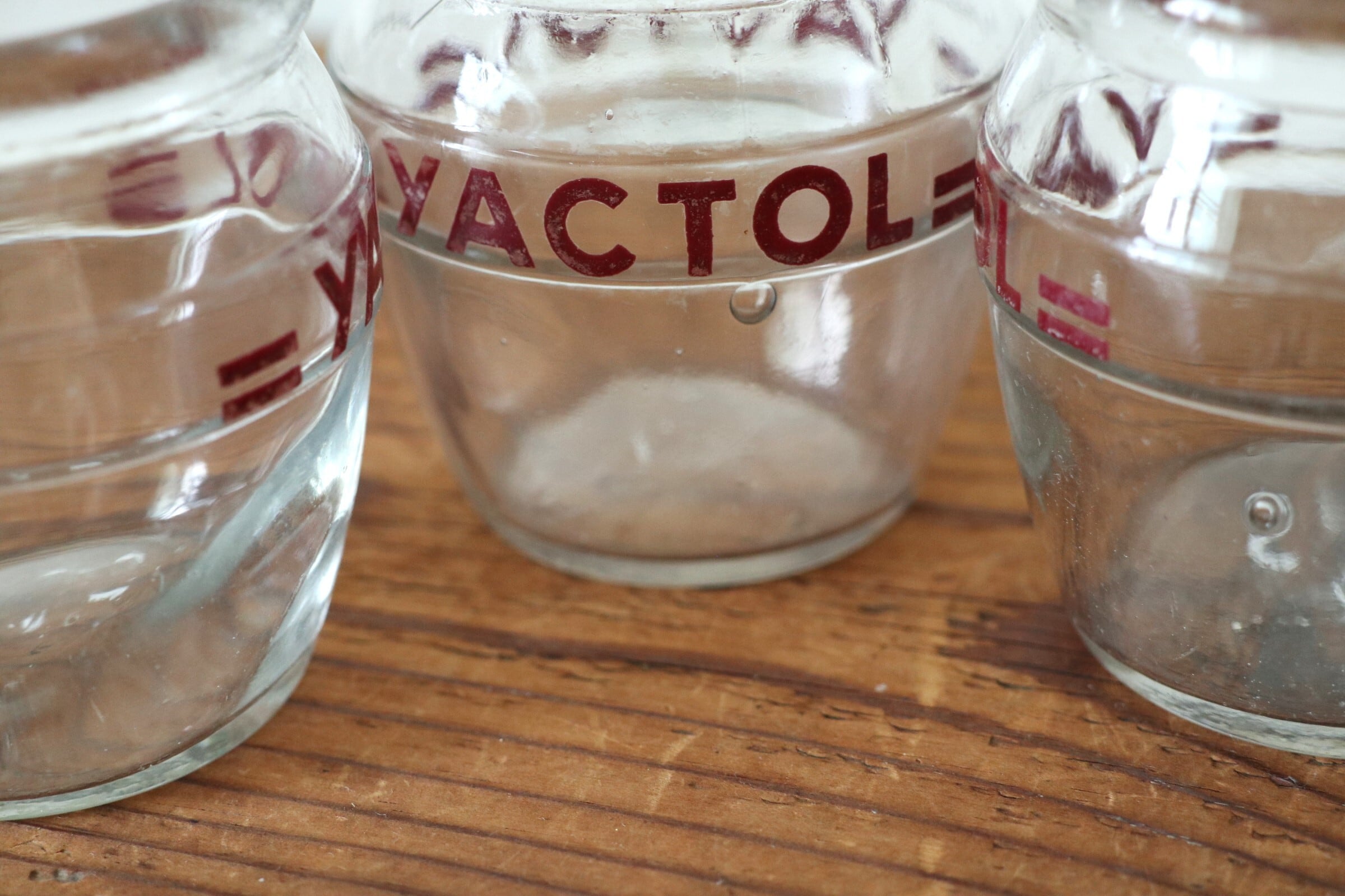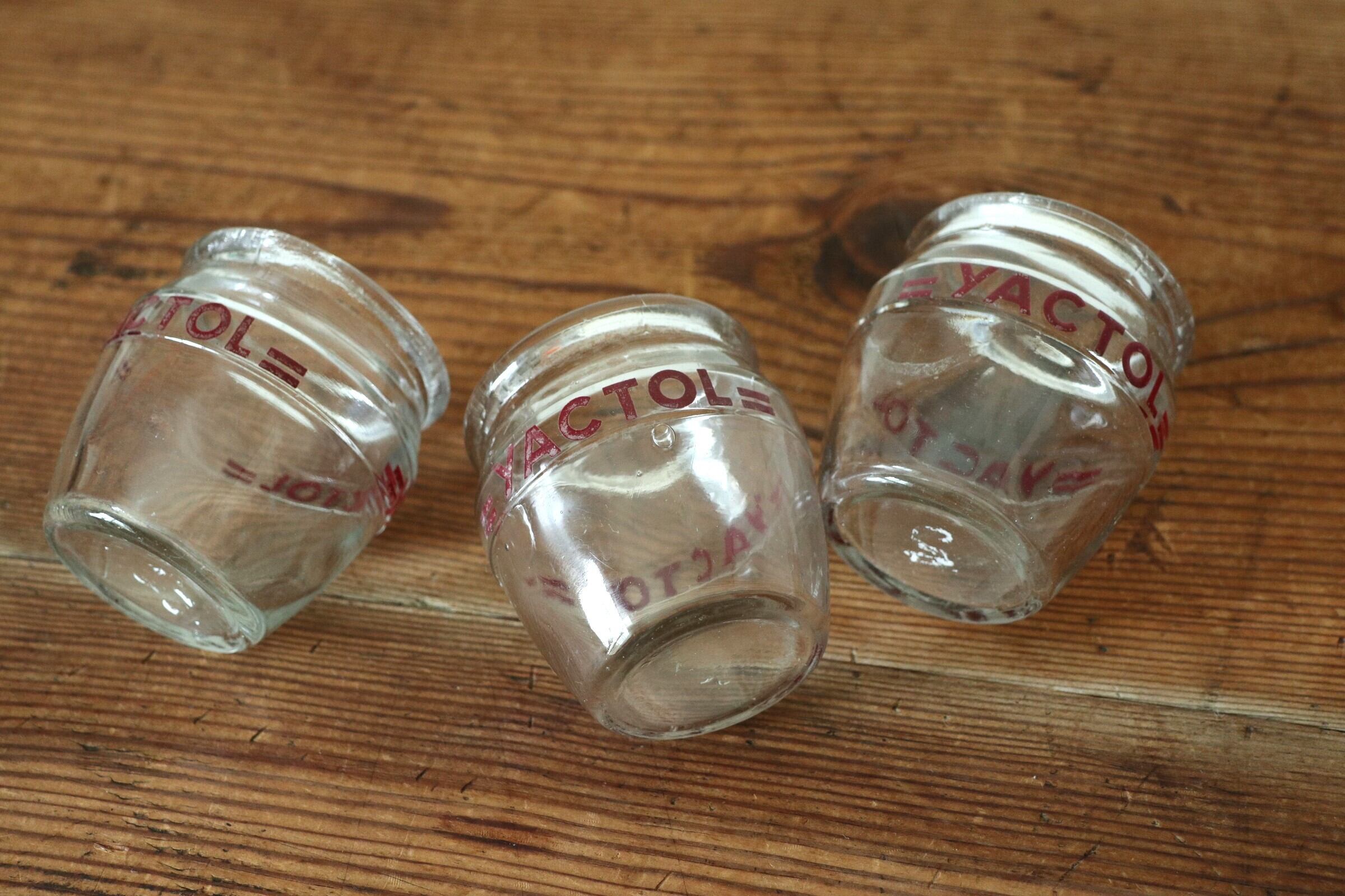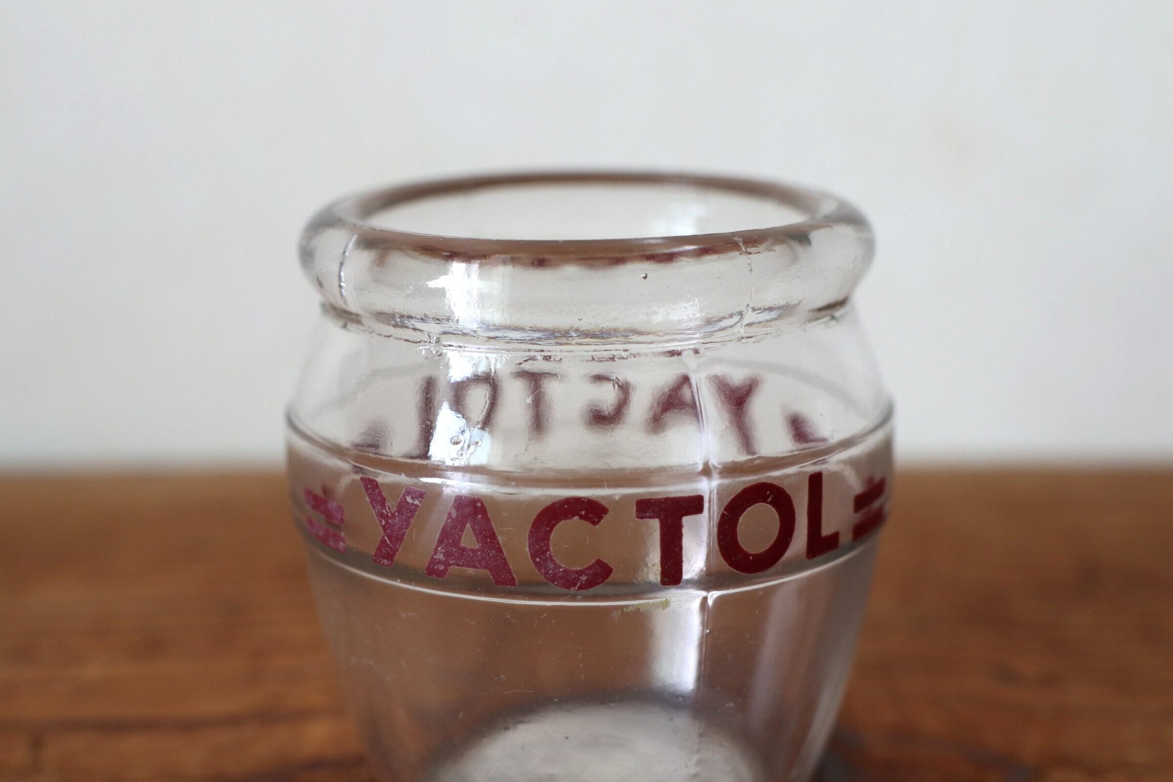 “YACTOL”と表示された、厚みのある吹きガラスのヨーグルトポット。