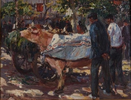 バスク織の始まりは、家畜として飼われていた牛を虫や強い日差しから守る役割として使用されいた“Moutet” (バスク語Saïal)です。/Louis Floutier (Toulouse1882-Saint-Jean-de-Luz1936)