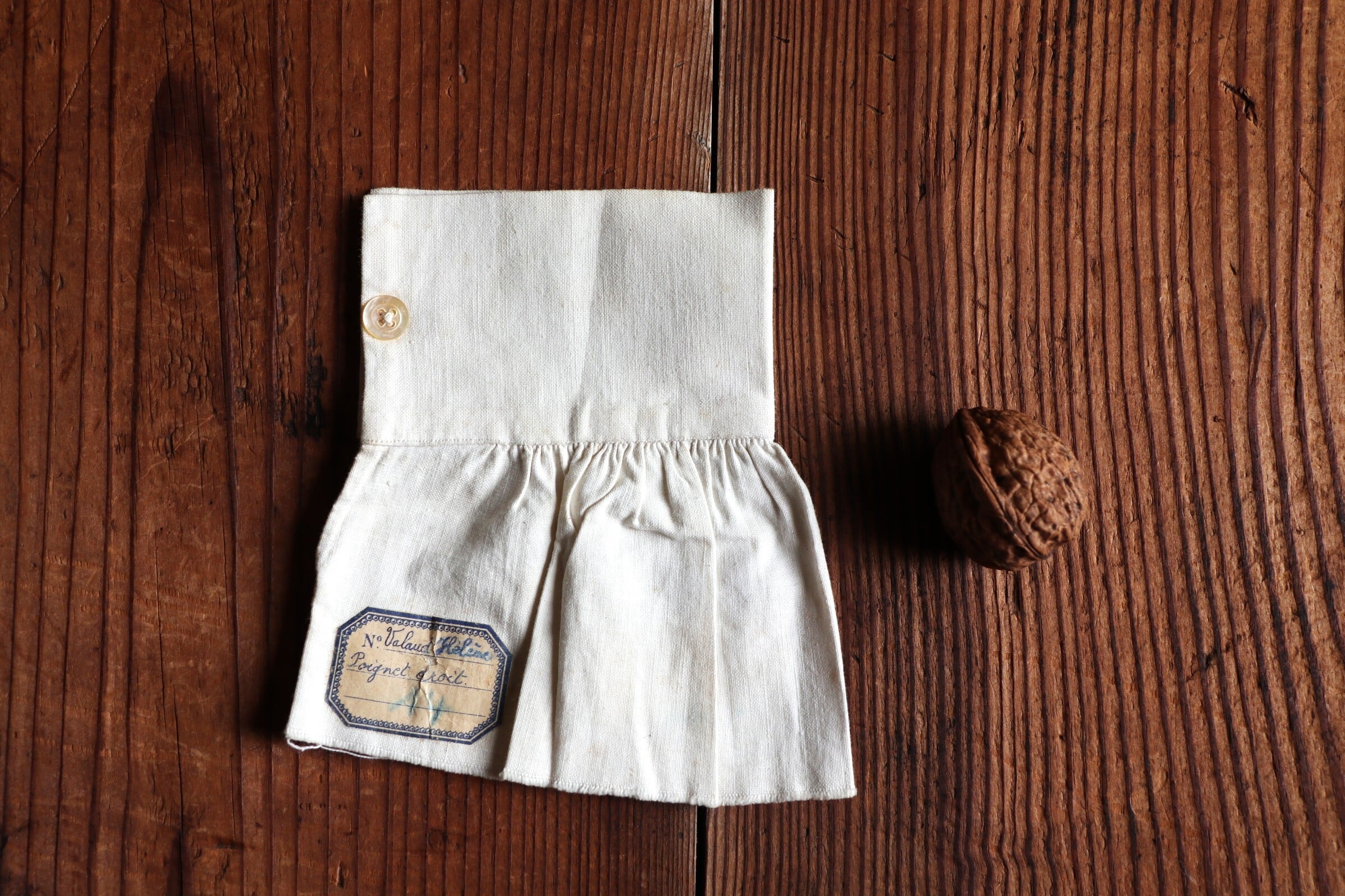 時を重ねた生地の風合いと、名前を記したラベルに心惹かれる一品です。