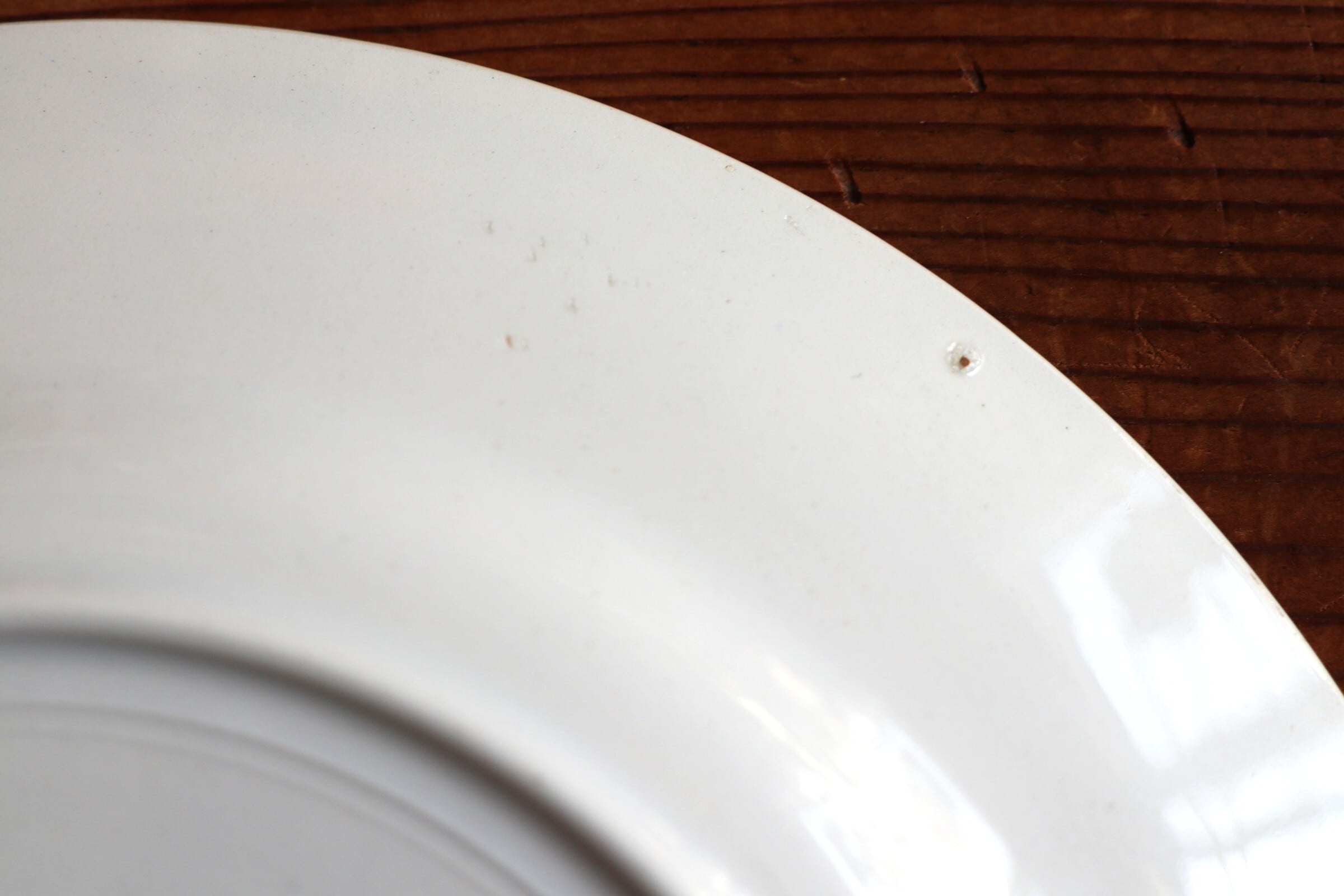 当店は100年程前からそれ以降の陶器·陶磁器を扱っております。そういった器は、水に浸かった際には貫入部分からの水ジミが"必ず"表面に出来ます。これは現代の物にも共通する事で、作陶時に生じるだけでなく様々な環境下での温度湿度乾燥を重ね、地の土や素材と釉薬の縮み、そして経年変化によって生じるものです。殆どの物が乾くと水ジミが消えて元に戻りますが、稀に色が濃く水分の多い食品等が器に触れた状態のまま長時間放置しますと、貫入状に色が沈着する(シミになる)恐れがあります。