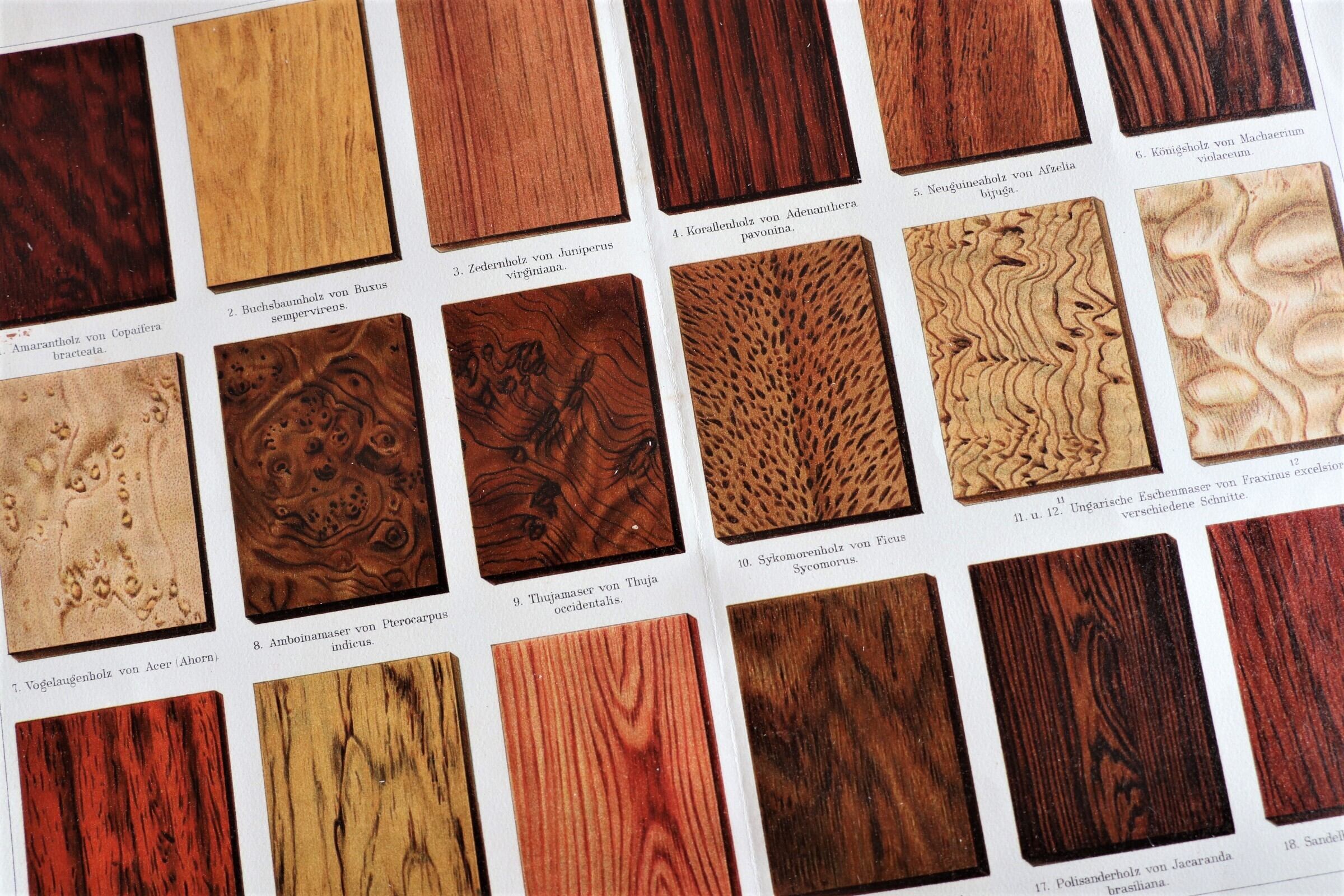 ドイツ Bibliographisches Institut in Leipzig(ライプツィヒ書誌研究所)発行の木材の種類が記されたリトグラフ(冊子の一部)。